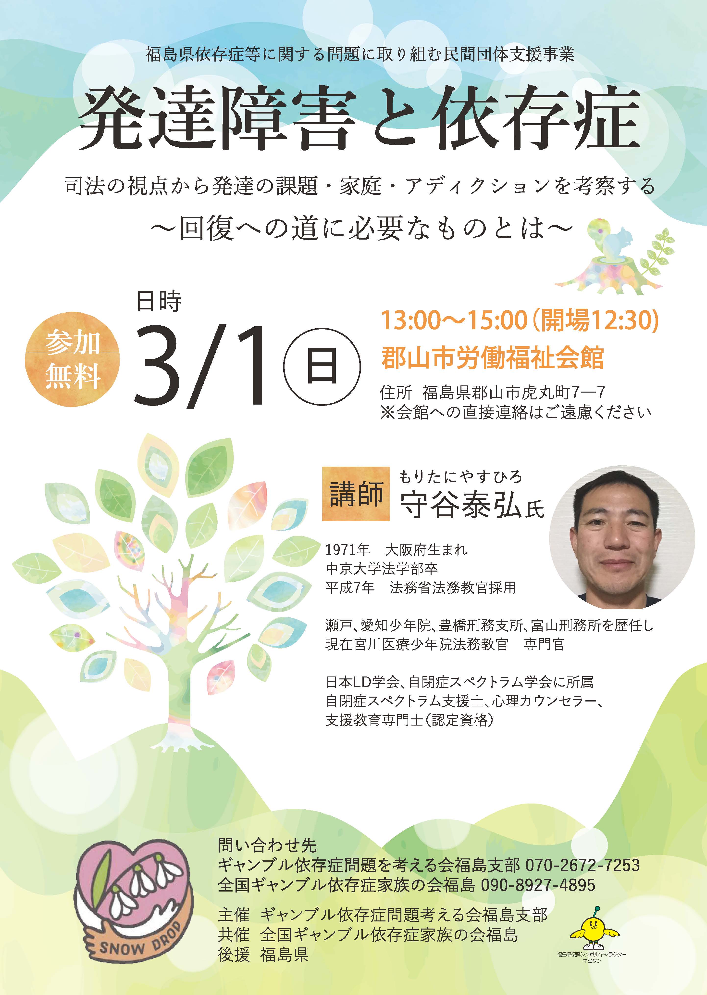 3月1日、郡山市内でギャンブル依存症問題を考える会福島支部主催の講演会「発達障害と依存症」が開催されるそうです。